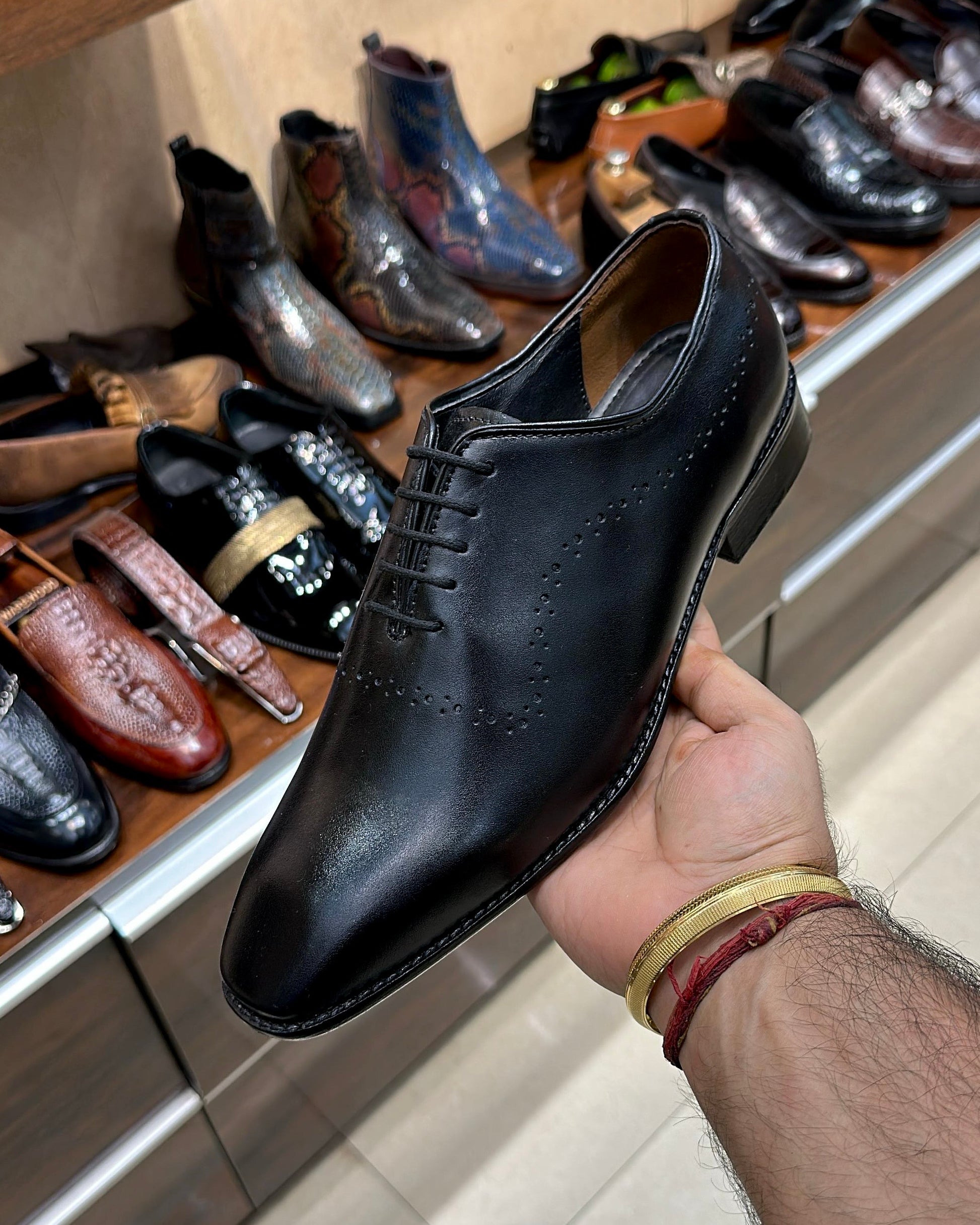 Black Italian Leather Whole-cut Oxfords with Broguing Details