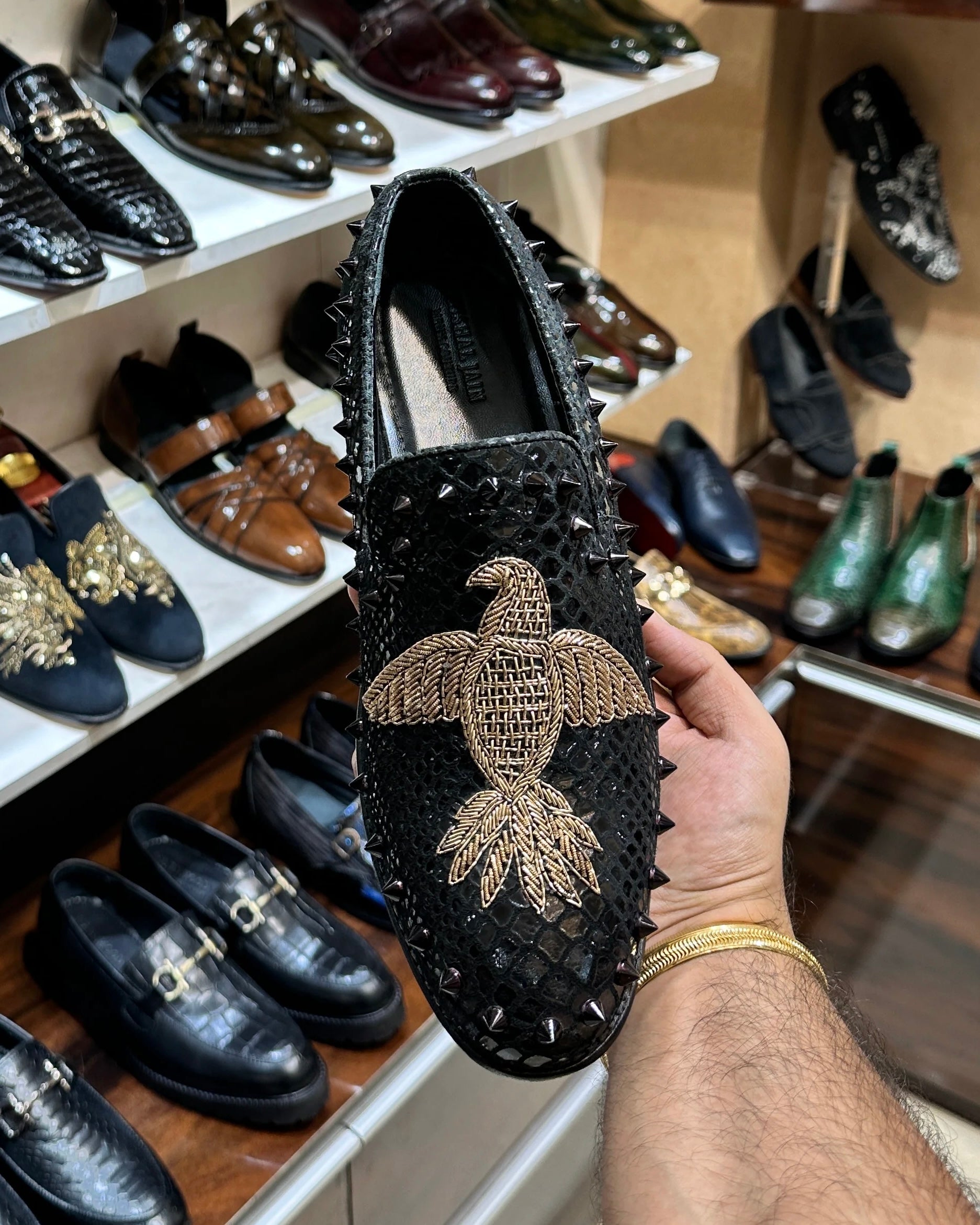 Signature Snake Foil Studded Bird Embroidery Slip-ons